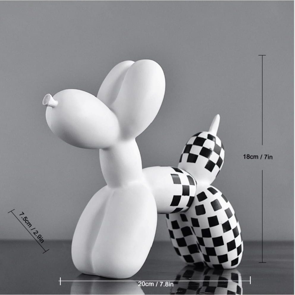 Un divertido perro globo en blanco sobre una base estilo ajedrez, ideal para dar un toque moderno y artístico.